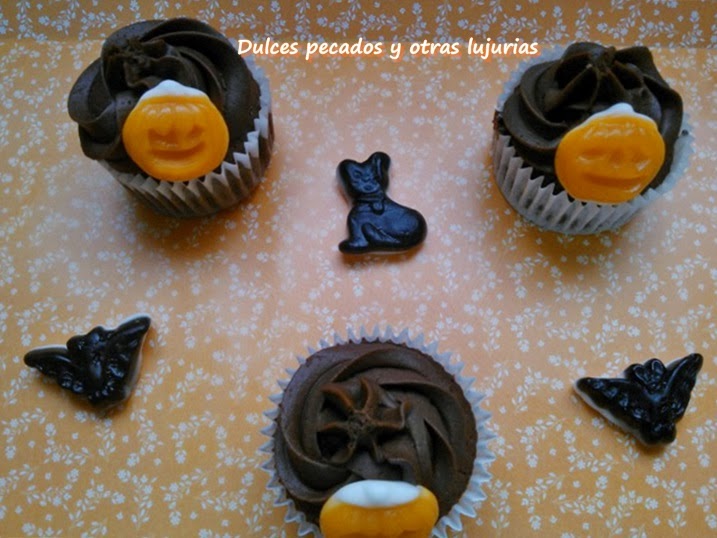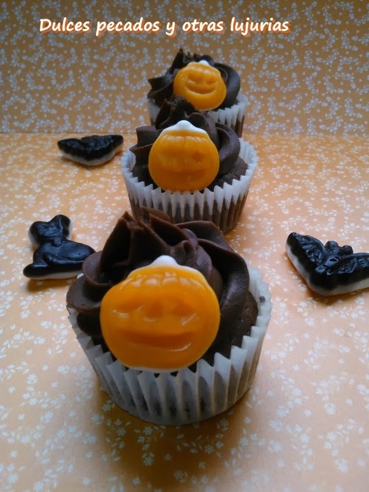Estas cupcakes en realidad son para cualquier época del año, pero aprovechando que me topé con un surtido de chuches para Halloween las adorné con esas calabacitas tan monas.