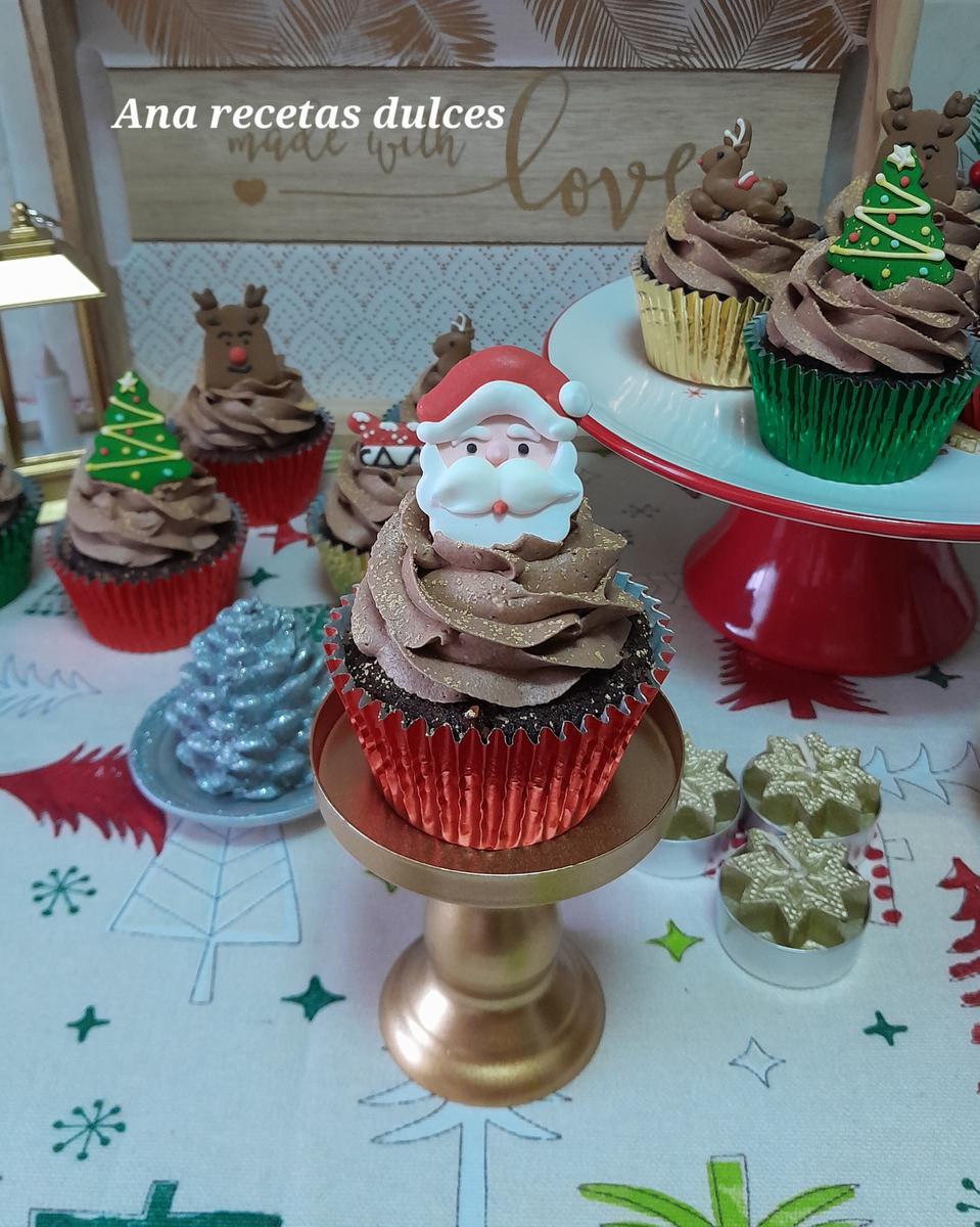 Decoramos los cupcakes con la buttercream a nuestro gusto, yo les he hecho unos copetes y los he decorado con purpurina comestible color oro y los he coronados con figuras de azúcar.