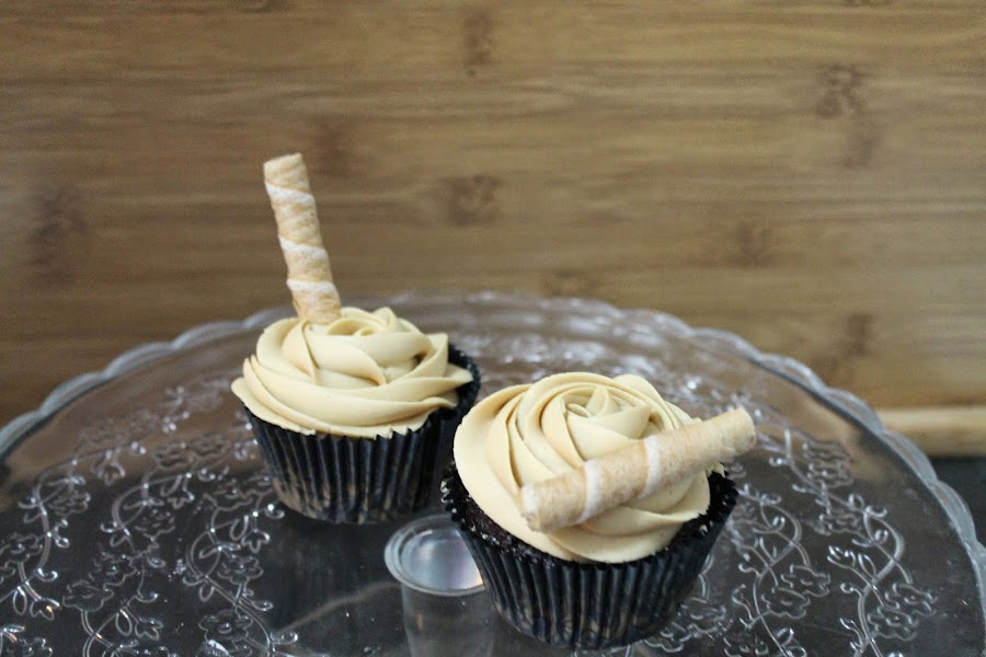 Batimos la mantequilla junto con el icing sugar previamente tamizado, primero durante 2 minutos a velocidad baja y luego durante 4-5 minutos a velocidad media, hasta que adquiera una tonalidad blanca. Añadimos la esencia de vainilla, el café en polvo y el sirope de chocolate y seguimos batiendo hasta que se hayan integrado los ingredientes.