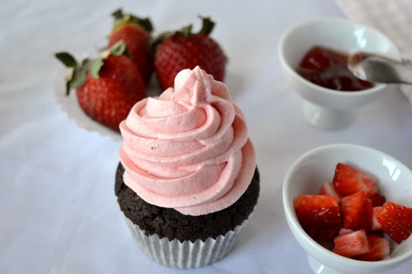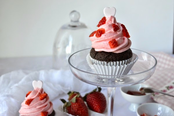 En estos cupcakes la crema de fresa (o fresones) se combina perfectamente con el chocolate y le aporta frescura, contraste que me encanta. Bueno, vamos allá con la receta que seguro estáis deseando verla.