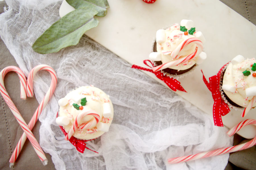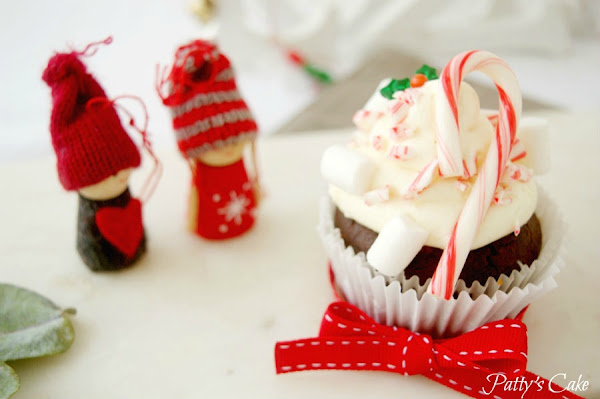 La crema que llevan es de chocolate blanco. La he hecho a partir de mi crema de mantequilla y queso que siempre hago. Le he añadido el chocolate blanco y listo. No soy muy amiga del chocolate blanco, pero para esta ocasión, creo que merecía la pena poner una crema blanquita, con colores de Navidad. Y, los adornos de menta son perfectos. Me encantan esos bastoncitos. Cuando los vi en el super me dije: ¡Para mí...!