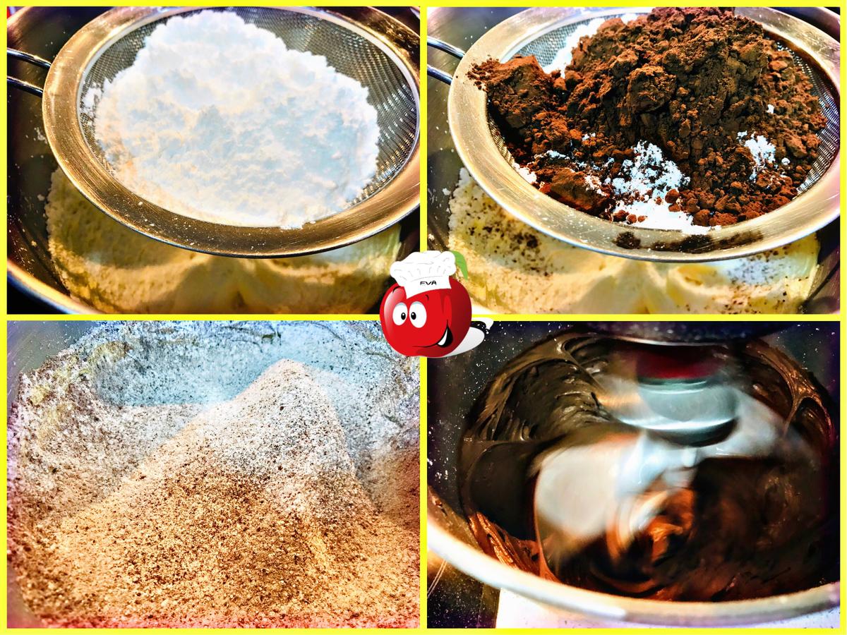 Para hacer el buttercream ponemos la mantequilla en la batidora y con la pala Ka batimos a velocidad máxima durante 5 minutos. Pasado este tiempo, paramos la batidora y con la ayuda de un colador tamizamos todo el icing sugar junto el cacao en polvo. Damos unos cuantos golpecitos al colador para tamizar el azúcar y el cacao