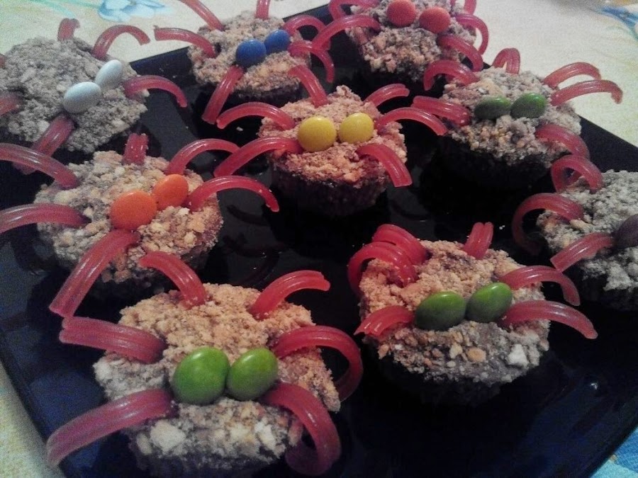 Cortamos regaliz rojo o negro, segun nos guste mas,del que viene enrrollado, y lo ponemos a modo de patas ( 6 trozos en cada cupcake).