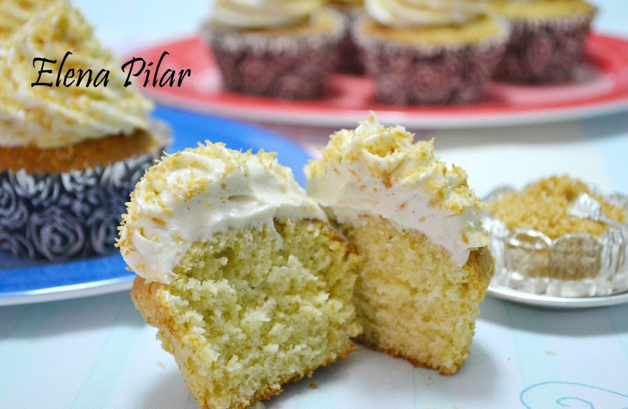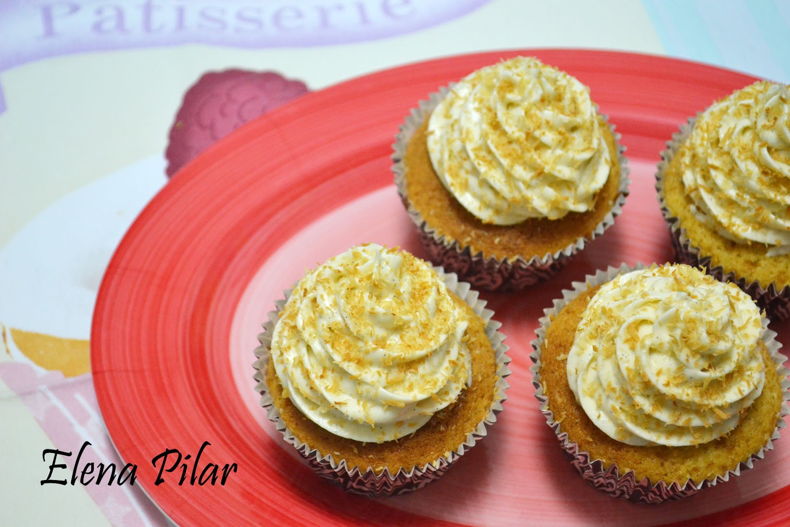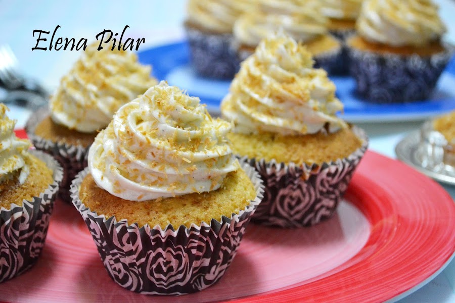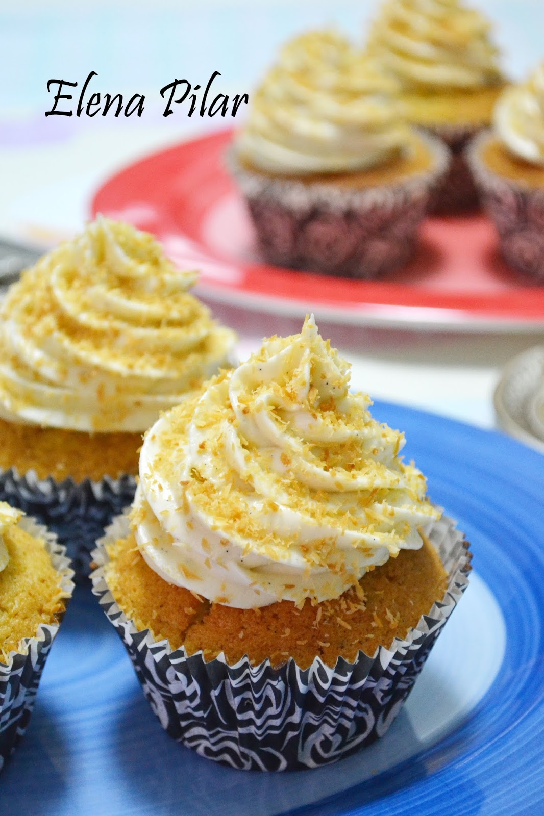 Rellenamos una manga pastelera con este frosting y decoramos nuestros cupcakes. Espolvoreamos un poco de coco rallado tostado por encima de cada uno.