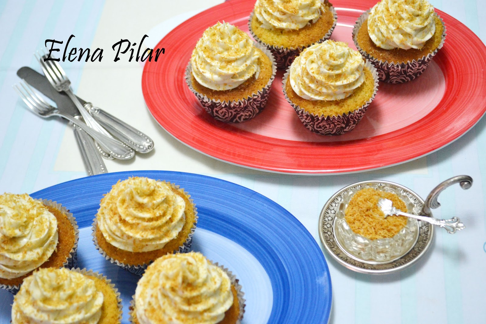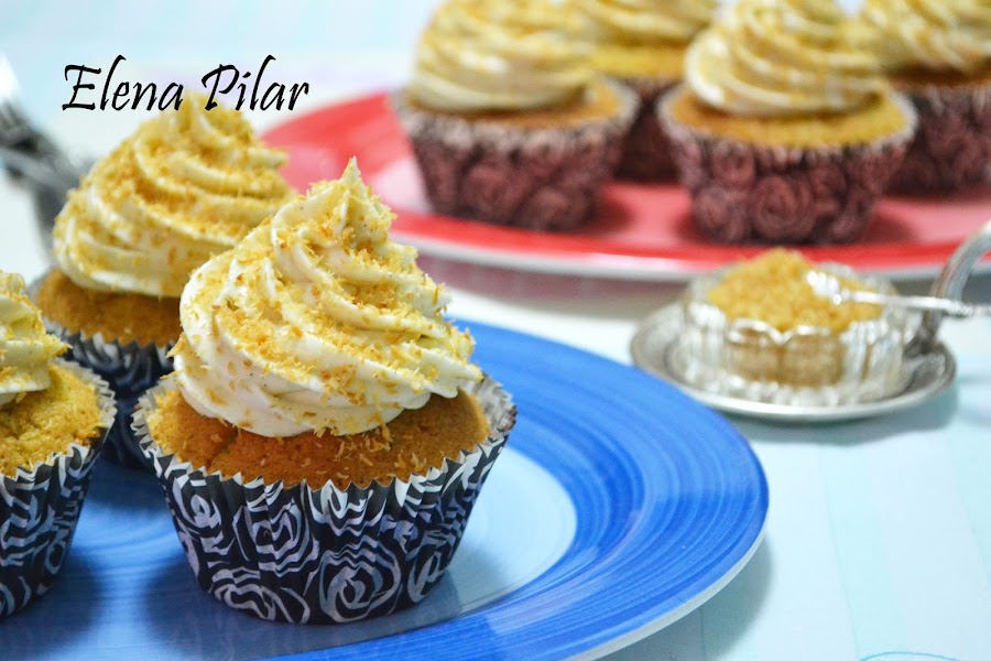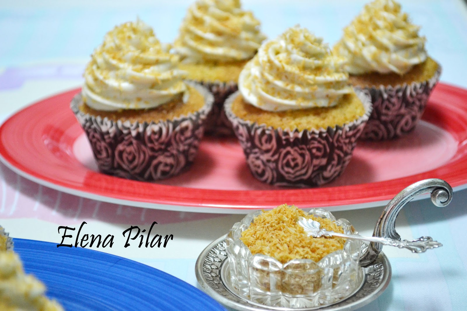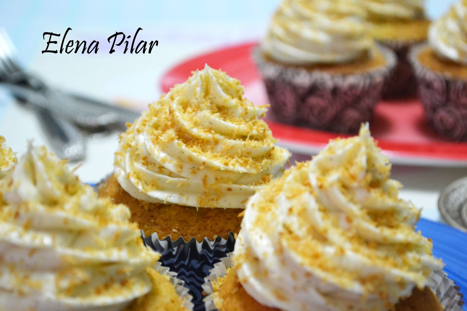 Rellenamos una manga pastelera con este frosting y decoramos nuestros cupcakes. Espolvoreamos un poco de coco rallado tostado por encima de cada uno.