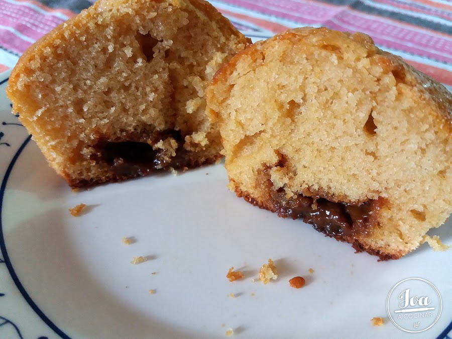 4 - Colocamos la preparación sobre cada molde de papel introducido previamente en el molde de cupcakes de silicona (el que tengan, o simplemente sobre una placa), y cuando cubrimos la mitad del molde, añadimos en el centro una cdta. de dulce de leche, terminando con un poco más de la preparación y espolvoreamos por encima con azúcar.
