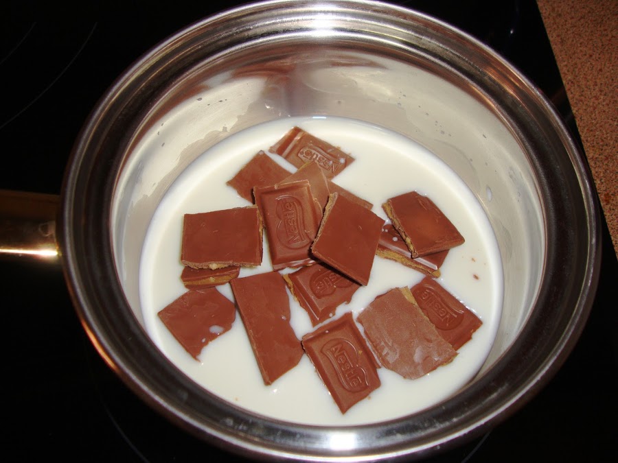 En un cazo a fuego medio ponemos la leche con el chocolate de dulce de leche hasta que se derrita y dejamos que repose.