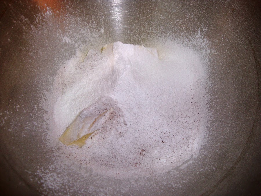 Derretimos el chocolate en el microondas (moviéndolo de vez en cuando) y dejamos atemperar. En un bol ponemos la mantequilla, el azúcar glass, el cacao y la leche.