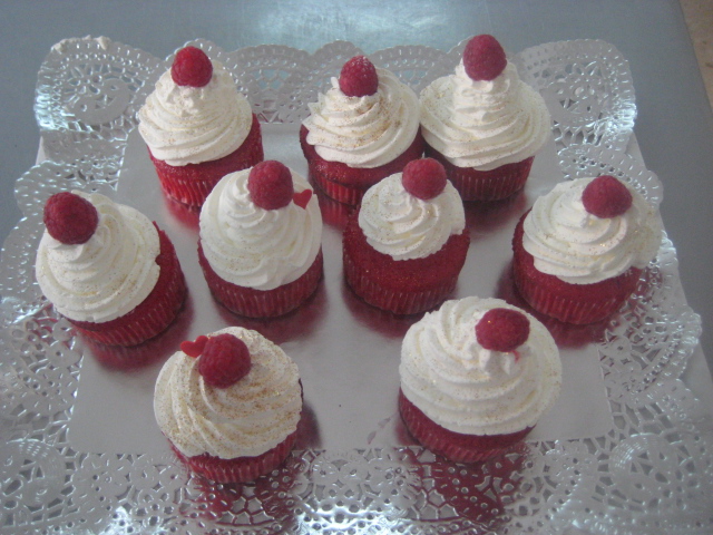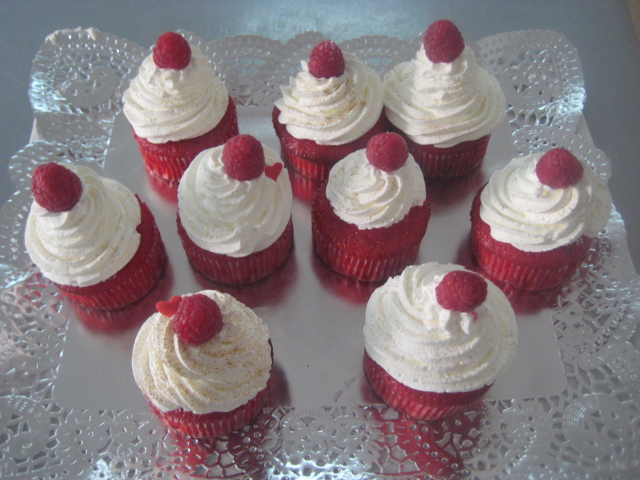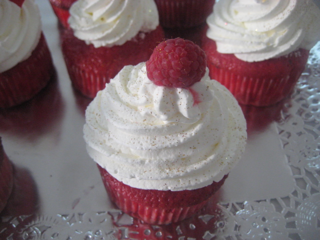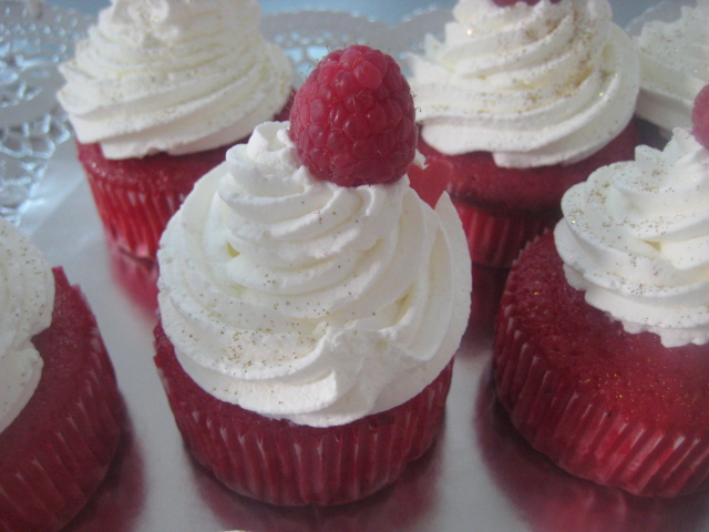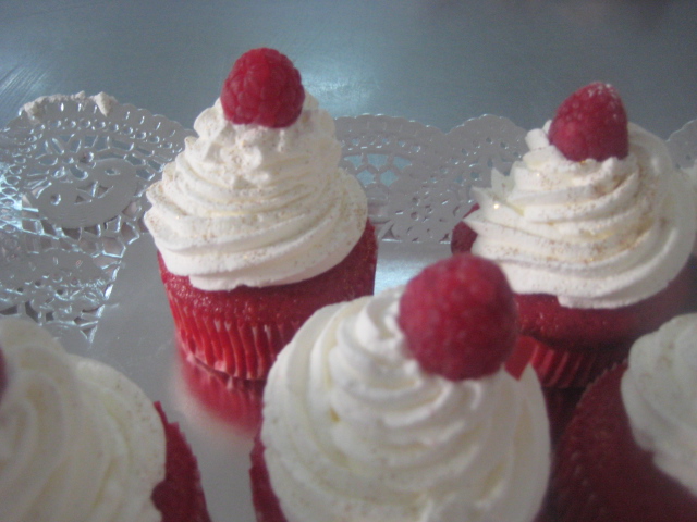 Preparación: Batir los huevos con el azúcar hasta que estén muy cremosos. Luego añadir la pasta de frambuesa y el aceite mientras se continúa batiendo. Mezclar la harina con la levadura química o impulsor y añadir a la preparación anterior. Batir de nuevo y dejar reposar la masa al menos media hora. Yo a veces la dejo de un día para otro. Poner cápsulas de cupcakes en un molde a tal efecto y poner la masa en una manga pastelera, abrir la manga y llenar los cupcakes en sus 2/3. Hornear a 185º C aproximadamente durante 18-20 minutos. Aunque como siempre esto depende de los hornos. Pinchar para verificar que están hechos, desmoldar y dejar enfriar sobre rejilla. Mientras tanto hacer la crema de queso. Poner en el bol de la batidora la mantequilla y el queso de untar a temperatura ambiente y trabajar unos momentos. Seguidamente añadir el aroma de vainilla y el azúcar glas y batir unos minutos, hasta que esté cremoso y homogéneo. Si es preciso agregar una cucharada sopera de leche. Cuando esté la crema hecha, reservar. Una vez fríos los cupcakes, poner la crema de queso en manga pastelera con boquilla rizada e ir preparando los cupcakes con la crema de queso y una frambuesa como adorno final. Terminar poniendo un poco de brillo dorado comestible.