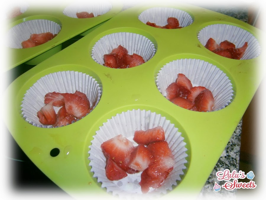 - Preparamos el molde de los cupcakes con sus papelitos, y repartimos las fresas troceadas entre todos los moldes de papel.