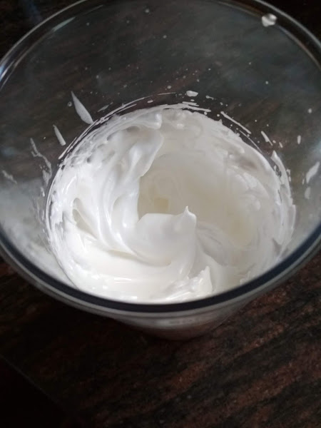 Para el merengue montamos las 2 claras a punto de nieve y cuando estén casi montadas se les añaden 50 grs. de azúcar y se sigue montando hasta que quede un merengue duro y brillante.