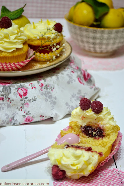 Hoy os traigo unos cupcakes muy refrescantes. Tienen un intenso aroma a limón y el contraste del dulzor de la crema de queso (aunque no es demasiado dulce) con la acidez de la frambuesa resulta en una explosión de sabor exquisito. Además, es indispensable que utilicéis buttermilk o suero de mantequilla en lugar de leche (abajo os explico cómo podéis hacerlo, si no lo encontráis), que suele estar en algunos Lidl.