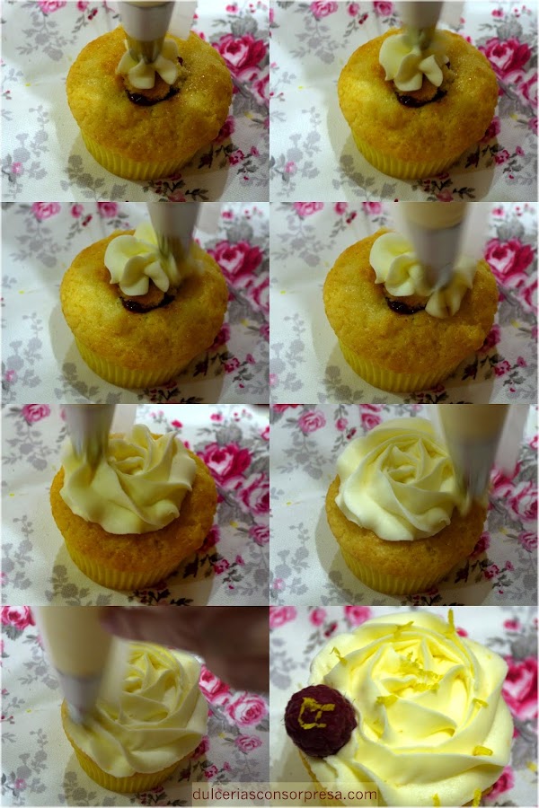 Os recomiendo que utilicéis frambuesas frescas para coronar vuestros cupcakes y aportar un toque especial al sabor, más ácido que la mermelada, si tenéis acceso a ella.