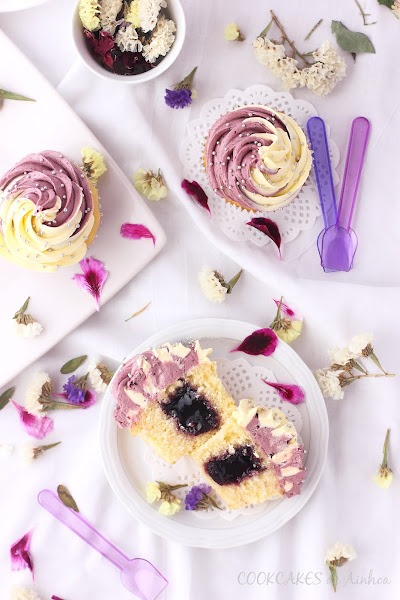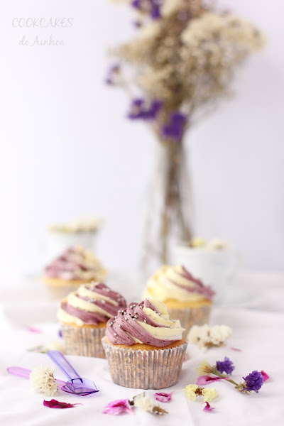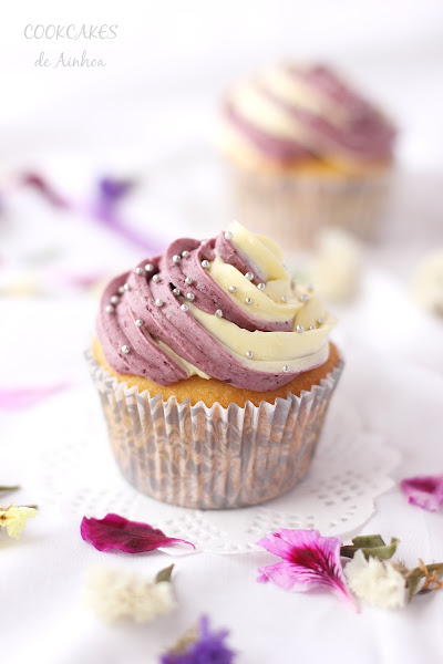En mis inicios como bloggera preparé unos cupcakes de fresa y chocolate blanco que me encantaron por su frosting de doble color y tenía unas ganas locas de volver a preparar unos parecidos. En esta ocasión, quería que los dos colores que aparecieran tubieran un gran contraste así que aprovechando el amarillo del limón y el tono liloso de la cereza negra, obtube un frosting de lo más llamativo. No creéis? A mi personalmente me encanta!