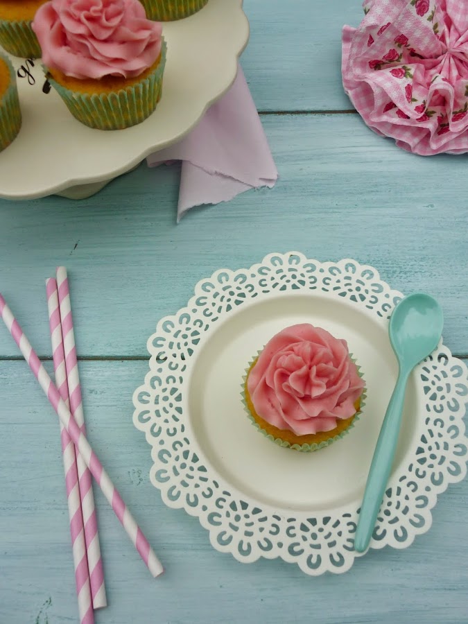 Montamos las claras (tardan bastante) hasta que formen picos, entonces añadimos la mantequilla trozo a trozo y batimos hasta que esté suave y sedosa. Incorporamos la esencia de fresa y una pizca de colorante rosa e integramos. Vertemos la crema en una manga pastelera con la boquilla que deseemos y decoramos los cupcakes.