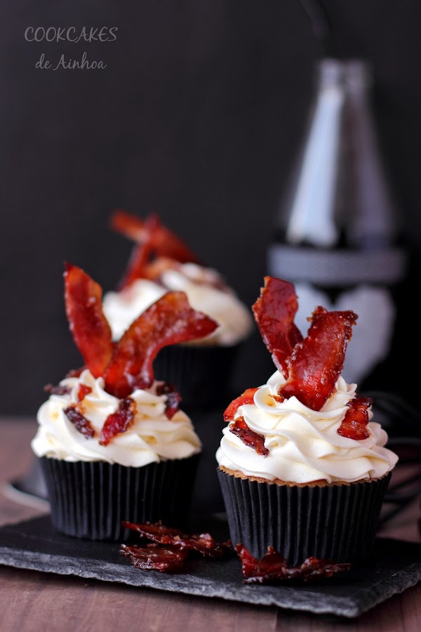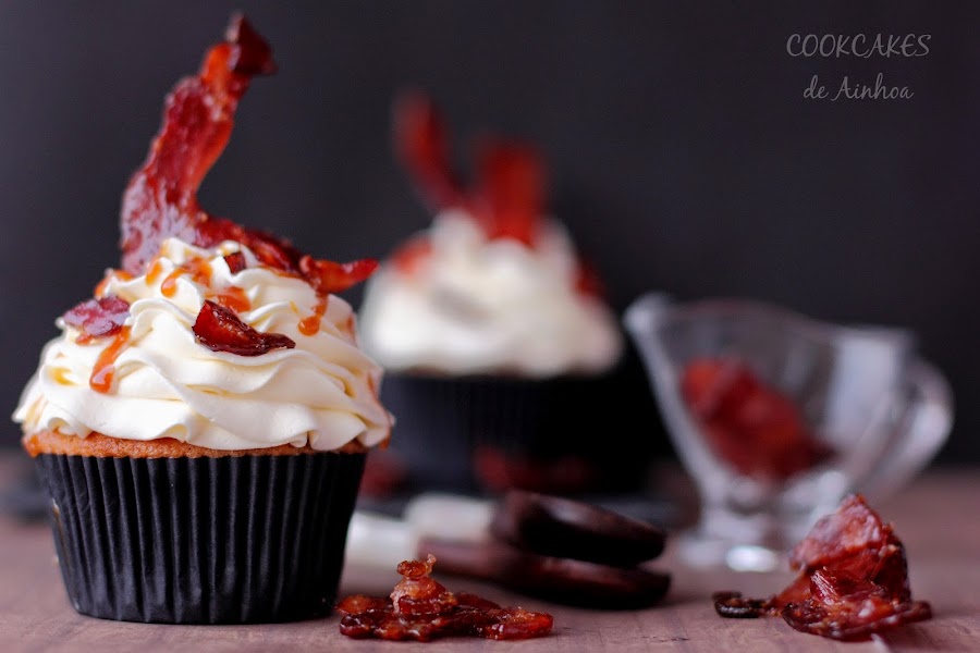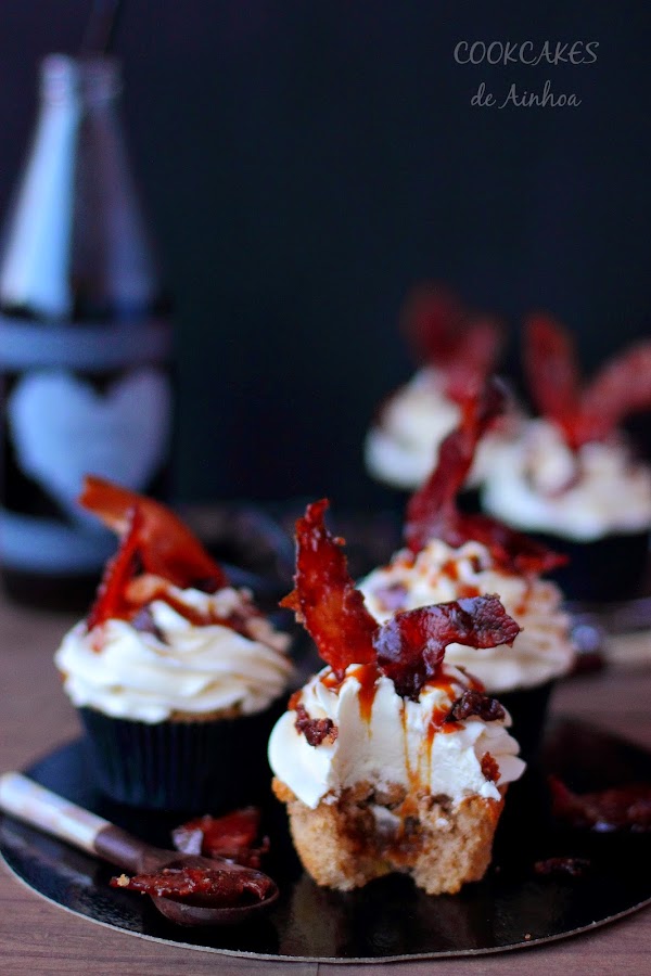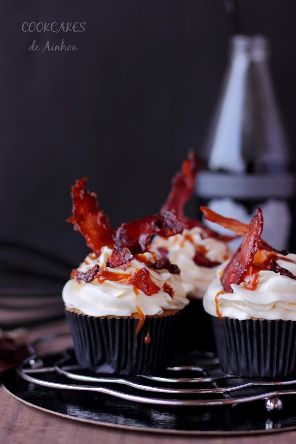 En cuanto a la buttercream, me ha parecido intenso en sabor :) fuertecito!! Pero la verdad es que como la base es tan sencillita pues permite disfrutar bien del sabor del whisky. Y con esos trozos de bacon, que le dan un toque crujiente, dulce por la caramelización pero salado cuando lo muerdes y lo masticas!!! Sólo os digo que Roger, mi chico, se comía los trozos de bacon como si fueran kikos... uno detrás de otro jajajajaja para verle jajajajajaja