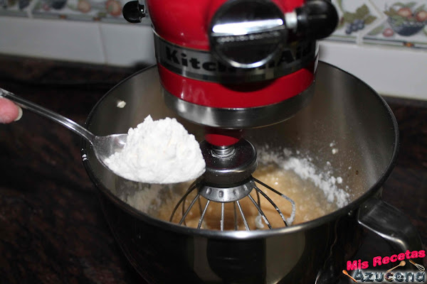 En un bol pondremos el azúcar junto con la mantequilla y con ayuda de unas varillas eléctricas lo batiremos bien hasta que blanqueen.