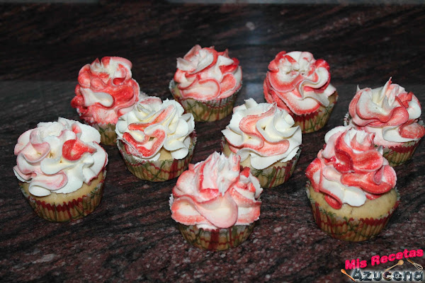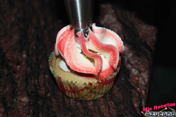 Para que la buttercream saliese de dos colores con ayuda de un pincel y el colorante rojo pinte unas líneas por dentro de la manga pastelera y luego introduje la crema.