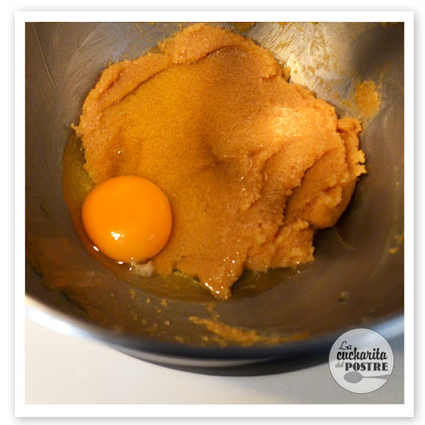 1. Bate la mantequilla con el azúcar moreno hasta que la masa blanquee y sea homogénea.