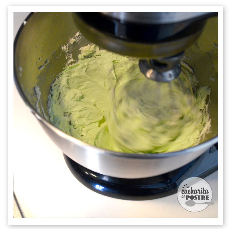 Esta pasta le aporta un tono verde pastel muy bonito, pero si usas un extracto o aroma incoloro puedes añadir un poquito de colorante verde para darle un poquito de gracia al frosting.