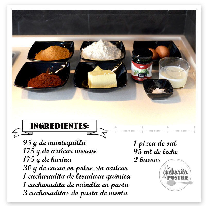 Ahí puedes encontrar los ingredientes necesarios según la cantidad de cupcakes que te salgan (para 6-8 cupcakes o para 12-16 cupcakes). Sólo debes añadir a los ingredientes unas cucharaditas de pasta concentrada de menta.
