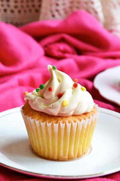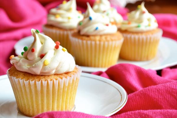 Cuando los cupcakes estén fríos ponemos un poco de crema sobre ellos, con ayuda de una espátula o de una manga pastelera. Yo usé una manga con boquilla de estrella y confeti de colores comestible.