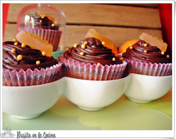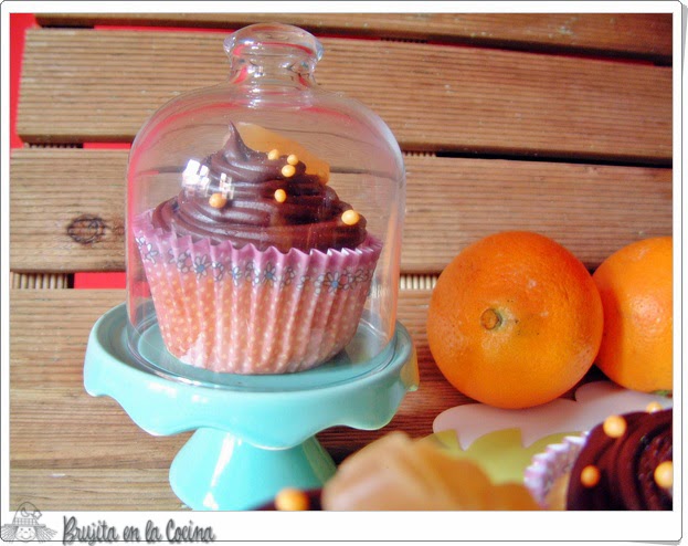 Una vez frios comenzamos con el montaje para lo cual, introducimos la ganache en una manga pastelera y cada base para tener unos ricos cupcakes de naranja y chocolate.
