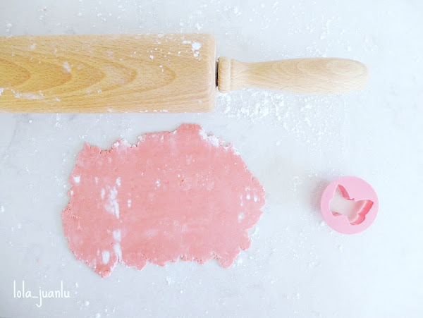 A la hora de darle forma, lo amasamos un poco y lo extendemos con un rodillo. Podemos espolvorear un poco de azúcar glacé si lo vemos necesario. En esta ocasión vamos a utilizar unos cortadores de mariposas de tamaño pequeño que coloraremos sobre la crema de mantequilla.