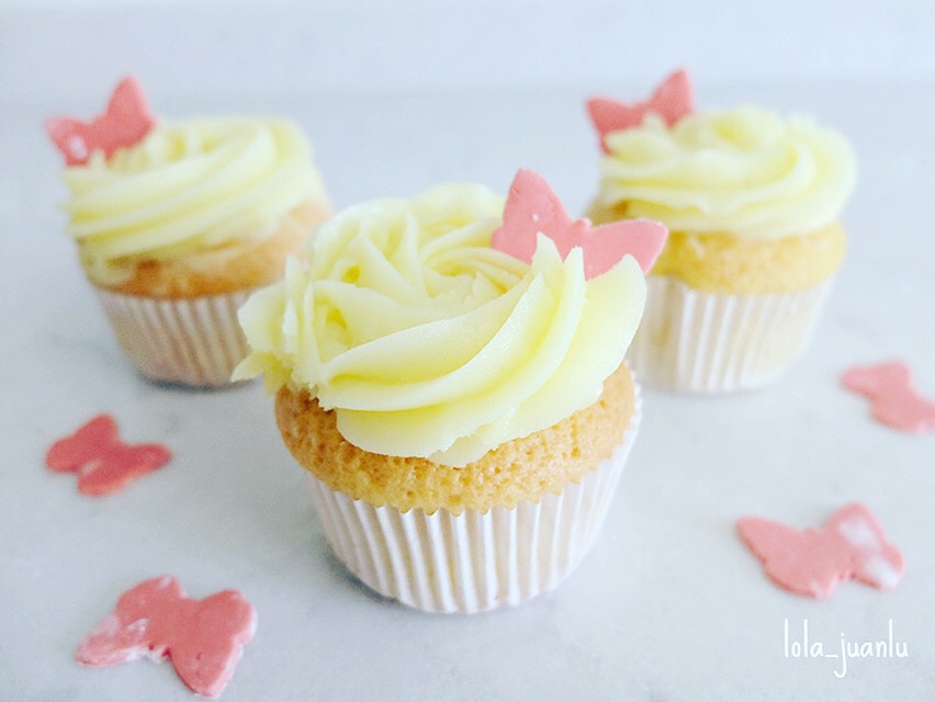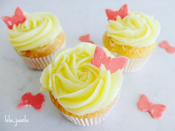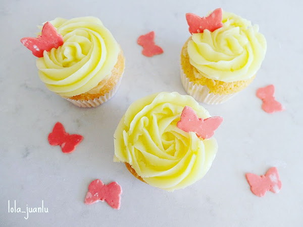 Cogemos la manga pastelera, colocamos la boquilla en vertical en el centro del bizcocho y giramos en el sentido de las agujas del reloj mientras apretamos de forma constante, de esta manera formamos una bonita rosa amarillita de crema de mantequilla sobre el bizcocho. Para terminar, colocamos una de las mariposas rosas.