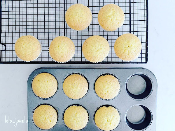 Sacamos los bizcochos del horno y los dejamos enfriar durante unos 5 minutos antes de sacarlos de la bandeja de cupcakes y dejarlos enfriar sobre una rejilla.