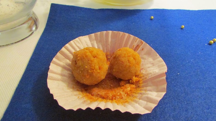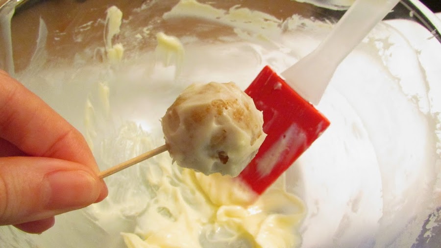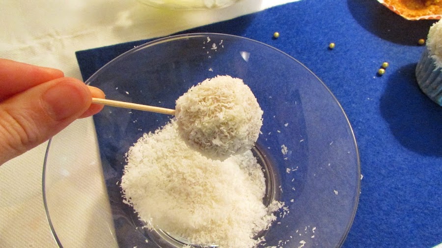 Con ayuda de un palillo las cubrimos con la crema de queso y después las pasamos por el coco rallado.
