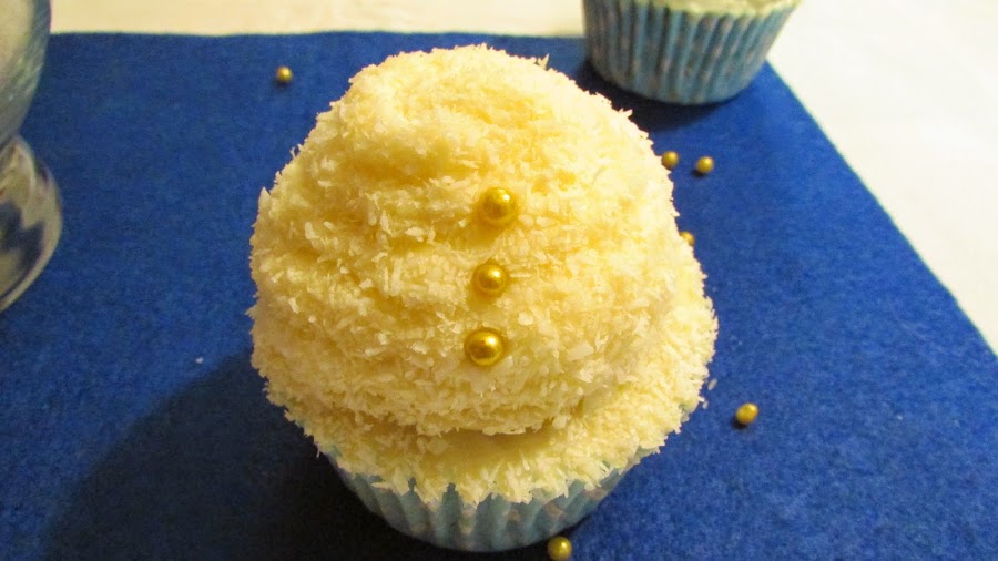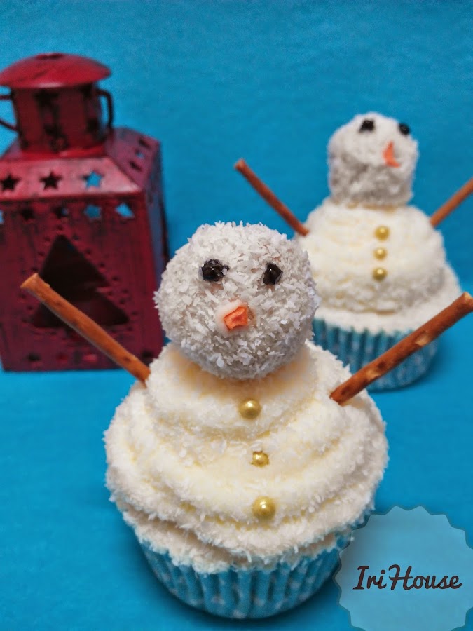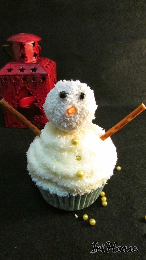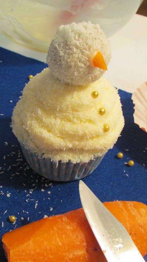 Esta vez he hecho unos cupcakes muy navideños, unos muñequitos de nieve de crema de queso (aquí la receta) y coco.