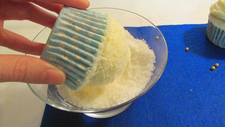 A continuación ponemos coco rallado en un pequeño bol para cubrir toda la crema de queso. Y decoramos con tres bolitas que simularán los botones.