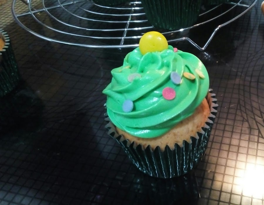 Si no tiene mucha consistencia se puede meter 15 minutos a la nevera .Se añade poco a poco colorante hasta tener el color deseado. La metemos en una manga con la boquilla 1M o 2D de Wilton, y empezamos a decorarlos. Primero hacemos un rosetón del centro hacia fuera, no muy grande y que no cubra toda la base. Cuando terminamos hacemos la "copa del árbol", debemos hacer un copete de fuera hacia dentro y según lo hacemos vamos subiendo la manga.