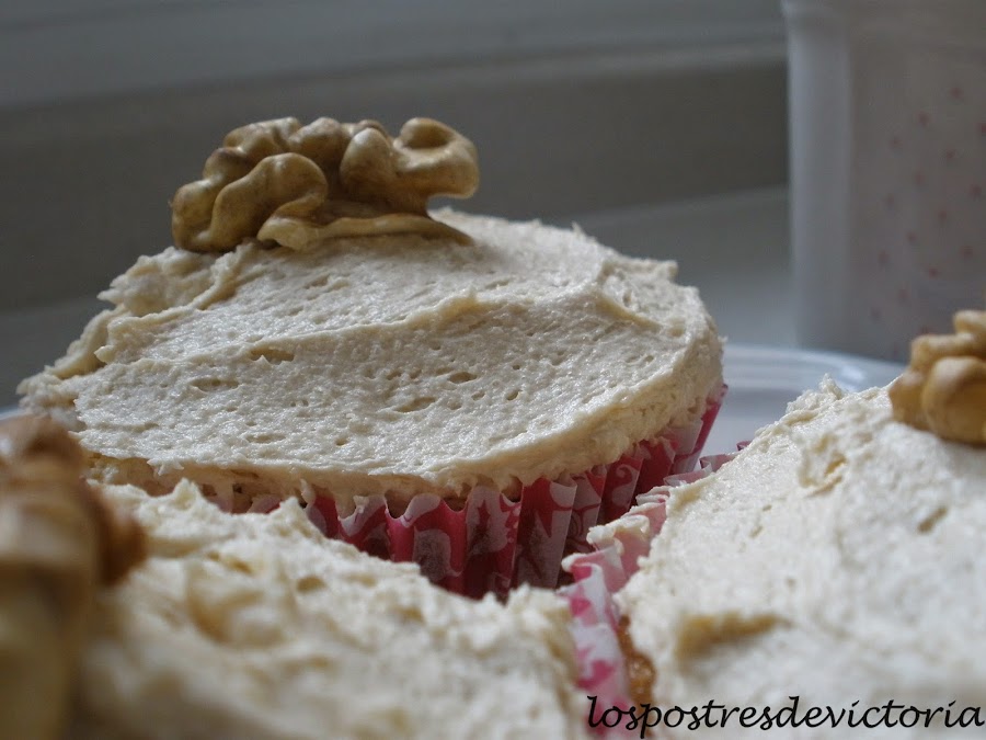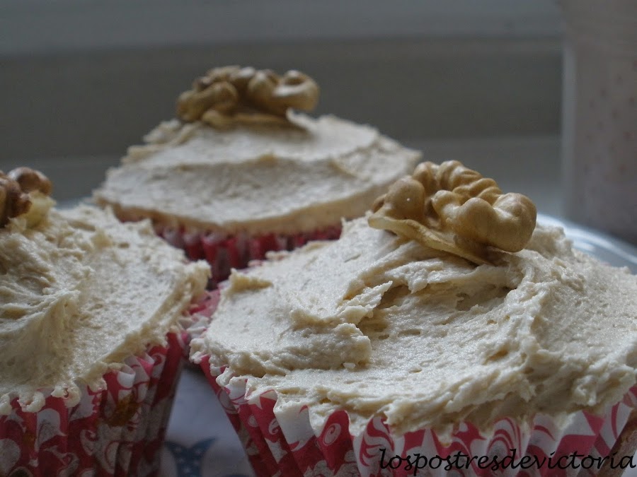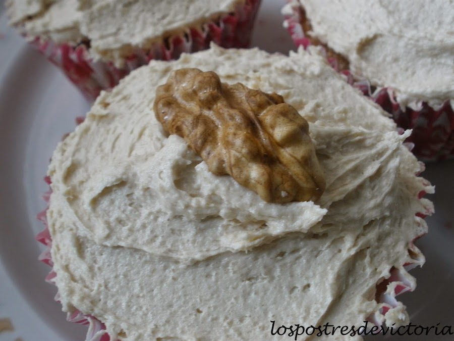 Ahora lo mas divertido, cubrirlos con el glaseado. Yo lo hice simplemente con una cucharilla pero si los queréis mas llamativos no dudéis en usar la manga pastelera y por supuesto ponéis media nuez encima.