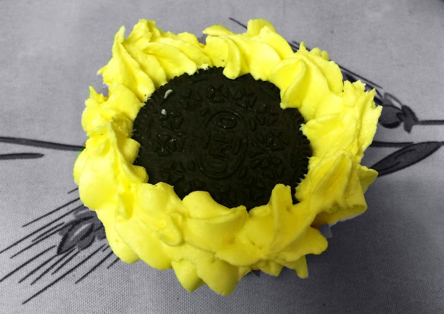 Ponemos la galleta oreo en el centro del pastelito, a su alrededor vamos haciendo piquitos con la buttercream. Y esté será el resultado, ¡unos girasoles!