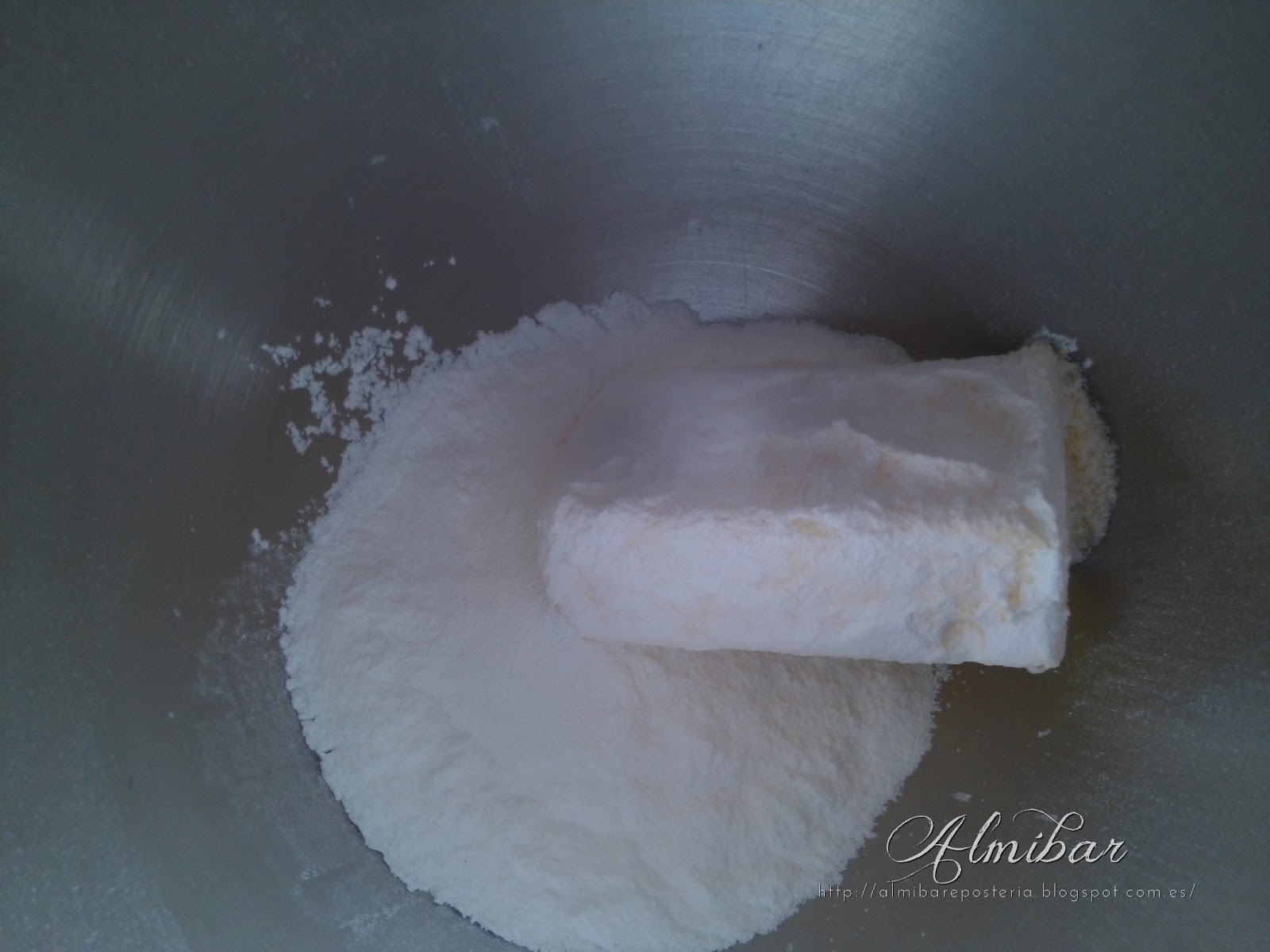 ...mezclas el polvo con la mantequilla en una batidora eléctrica hasta que doble su volumen...