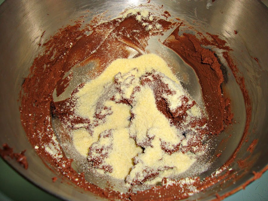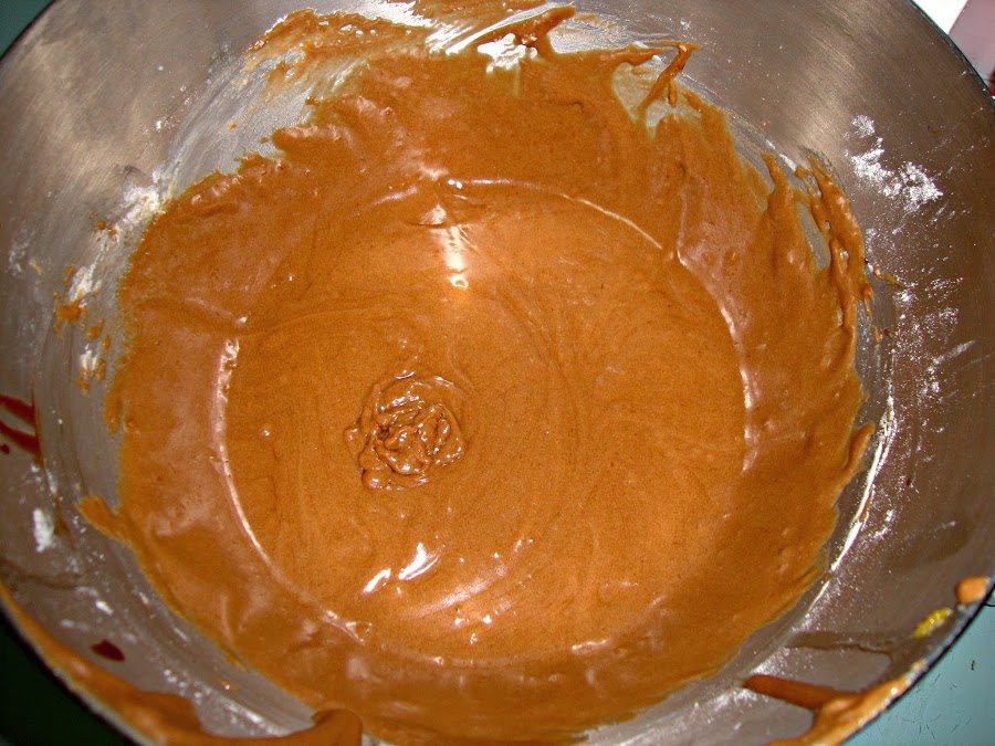 Luego se le añade con un chorrito fino y lentamente la mezcla de mantequilla con chocolate y luego se va alternando la harina (tamizada con la levadura) con la leche.