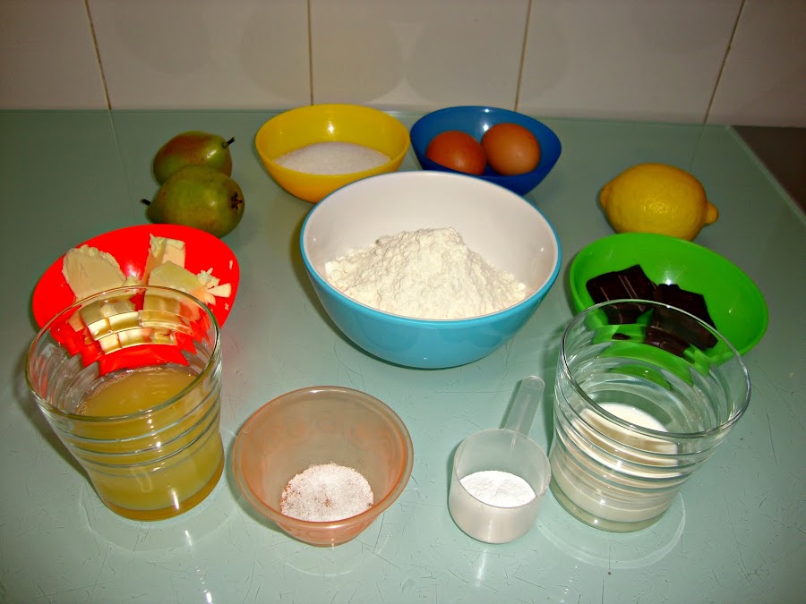 Pelamos las peras y las cortamos en gajos, las ponemos en un cazo con la ralladura del limón, dos cucharadas de zumo de limón, el zumo de manzana y dos cucharadas de azúcar ( de la que tenemos pesada), lo llevamos a ebullición y dejamos cocer durante 5-6 minutos (que se queden enteras), luego se escurren y trocean.
