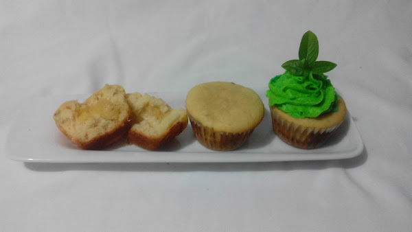Hacemos un Buttercream al que agregaremos 1 y 1/2 cucharada de ron y un toque de pintura verde. Decoramos con el buttercream y colocamos ralladura de limón y hierbabuena fresca como decoración.
