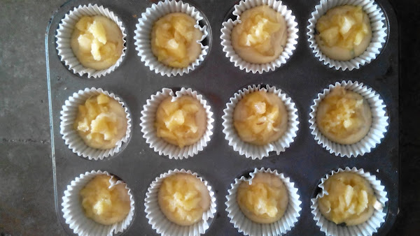 Preparamos nuestro molde para cupcakes y le colocamos las cápsulas de papel. Comenzamos a vertir la mezcla en los moldes solo hasta 1/4 de altura, luego ponemos 1 o 1 y 1/2 cucharadas de piña en trocitos en el centro y cubrimos con más mezcla hasta llegaar a los 2/3.