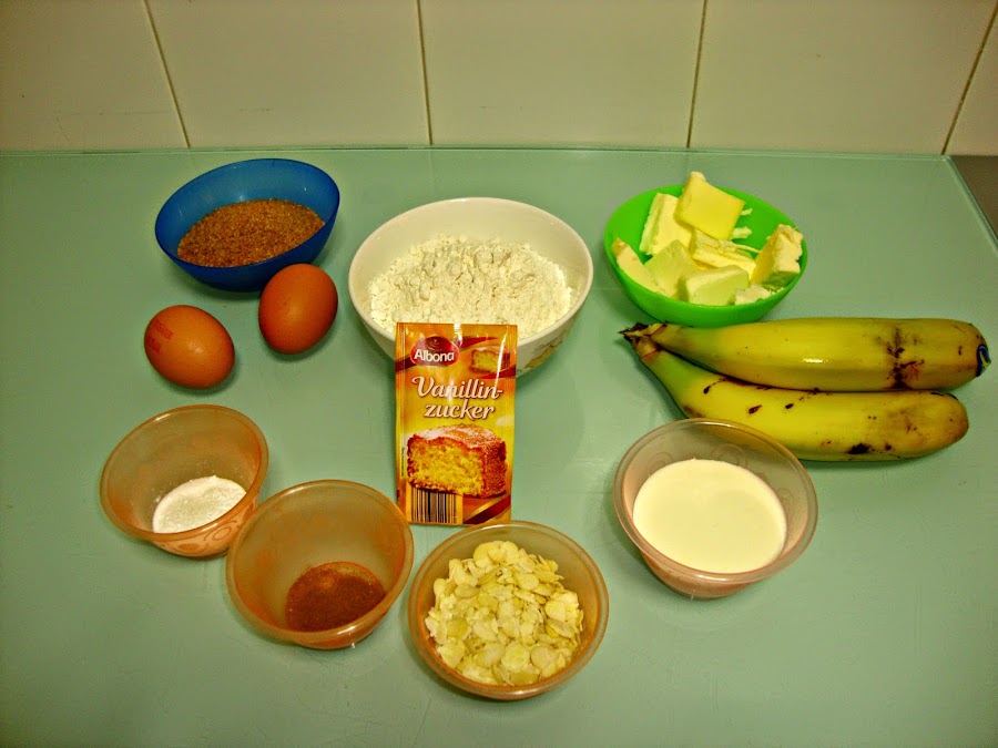 En un bol tamizamos la harina con el bicarbonato, la sal, la levadura y la canela. En un recipiente cortamos o chafamos los plátanos y añadimos la nata (crema de leche).