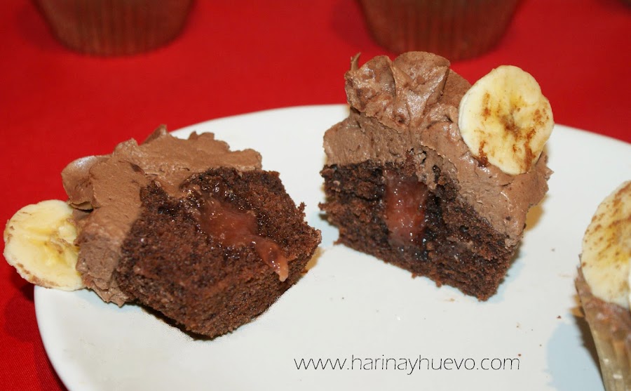 Mientras hacía la tarta me dije que esta combinación de sabores quedaría genial en un cupcake, y de aquí surgió la receta de hoy: Cupcakes de chocolate rellenos de plátano. Vamos al lío.