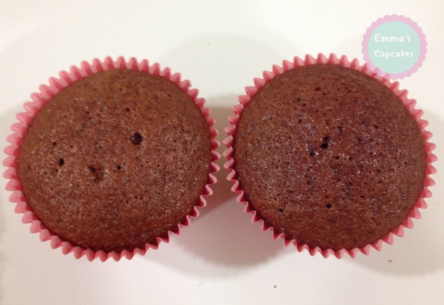 Rellenamos la bandeja de cupcakes con las cápsulas. Ponemos la leche y el limón en un vaso unos 5-10 minutos hasta que se corte, simulando el "buttermilk". En un bol batimos el azúcar y el aceite hasta que liguen. Sin dejar de batir, añadimos el huevo y el extracto de vainilla. Tamizamos la harina junto con el cacao y agregamos la mitad a la mezcla a velocidad baja. Incorporamos la leche y luego el resto de harina y cacao que queda y mezclamos bien, sin sobre batir que sino nos quedarían unos cupcakes duros.