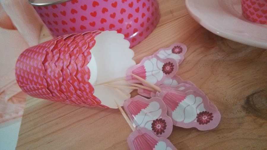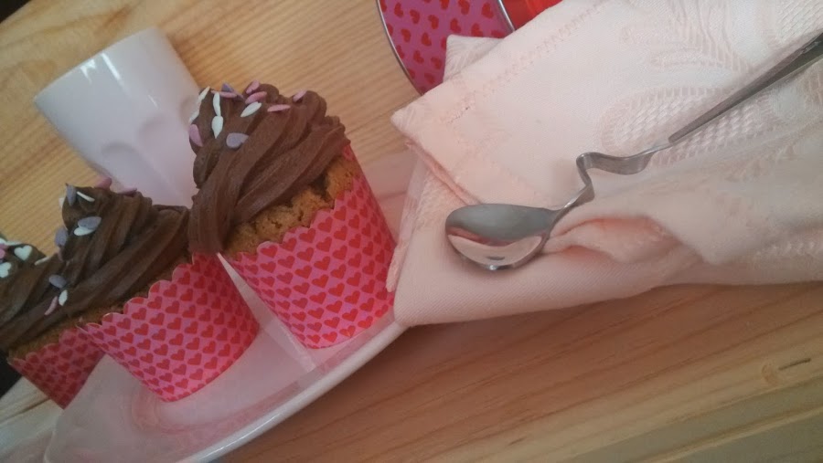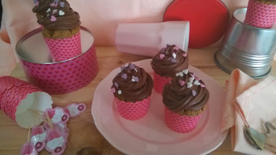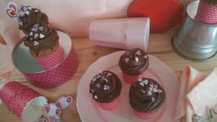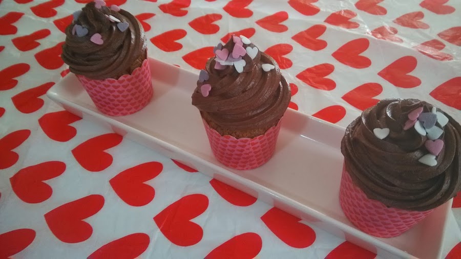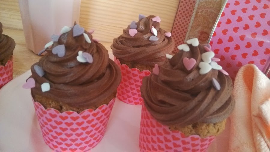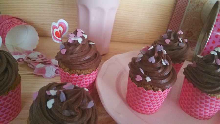 Una vez fríos del todo le pondremos el buttercream de chocolate y los decoraremos a nuestro gusto!! Yo he puesto el buttercream en forma de "cono" de helado y luego he puesto "sprinkles" de corazones. Si si habéis oído bien "sprinkles", esas decoraciones pequeñitas de azúcar, pero en termino anglosajón jeje