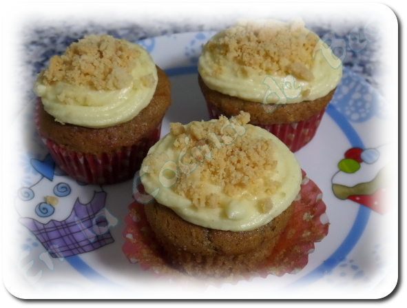 Además del bizcocho, llevan un delicioso relleno de manzana, van cubiertos de crema de queso y rematados por un crumble de almendras que está de vicio.