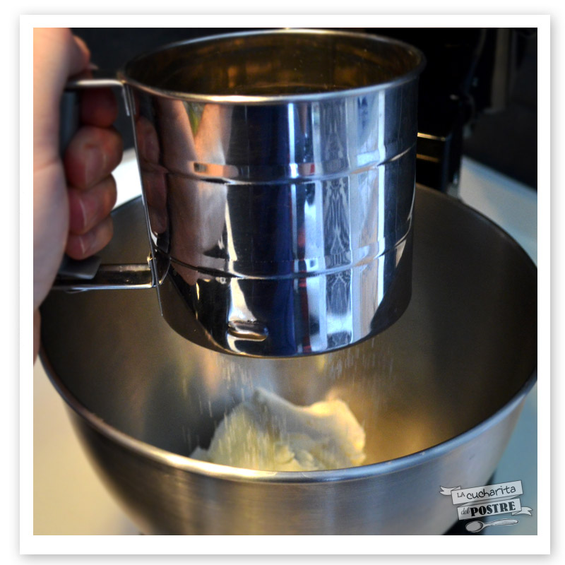 1. Pon el queso cremoso en el bol de tu amasadora y tamiza sobre él la harina.