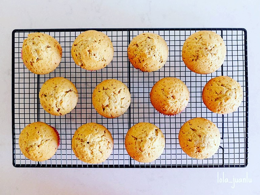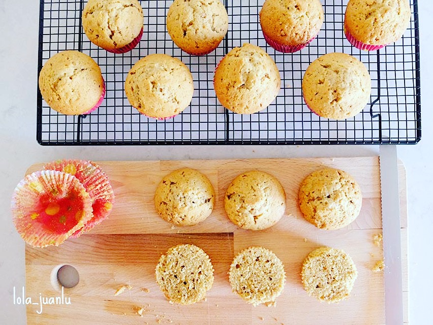 Transcurridos los 25 minutos, comprobamos con la ayuda de un palillo o cuchillo si la masa está hecha. Si el palillo sale limpio, los sacamos del horno y si no, lo dejamos unos minutos más. Sacamos del horno y dejamos enfriar. Pasados unos minutos, extraemos de la bandeja los cupcakes y los dejamos que sigan enfriándose sobre una rejilla.