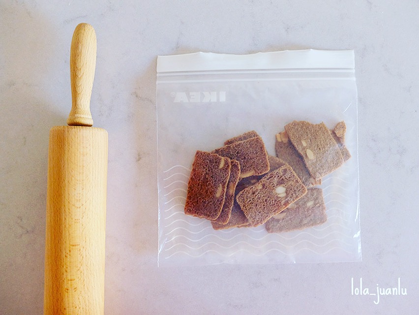 Trituramos las galletas y reservamos. Como mi robot de cocina sigue en reparación, he tenido que triturar las galletas de forma manual, así, las he metido en una bolsa con autocierre y he pasado el rodillo sobre ellas. Una forma fácil, rápida y limpia.