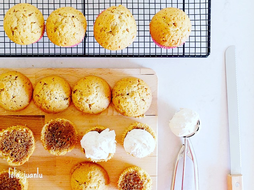 Preparamos una bandeja para cupcakes en la que colocamos las cápsulas de papel en sus orificios. Con la ayuda de una cuchara de helado, repartimos la mezcla. Damos unos golpecitos para que la masa se asiente o igualamos con el reverso de la cuchara de helado. Llevamos al horno, colocamos la bandeja a una altura media baja y horneamos durante 25 minutos.